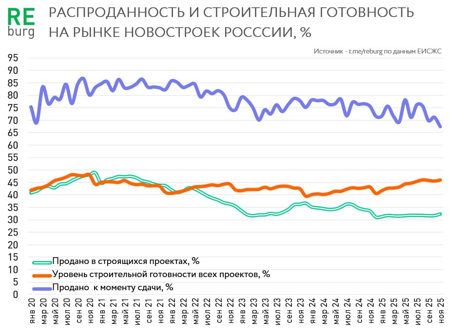 Распроданность квартир на этапе ввода в эксплуатацию в 2023-25 гг оставалась в стабильном диапазоне: 70-80%. Но показатель ноября 2025 упал до минимального уровня в 67%.