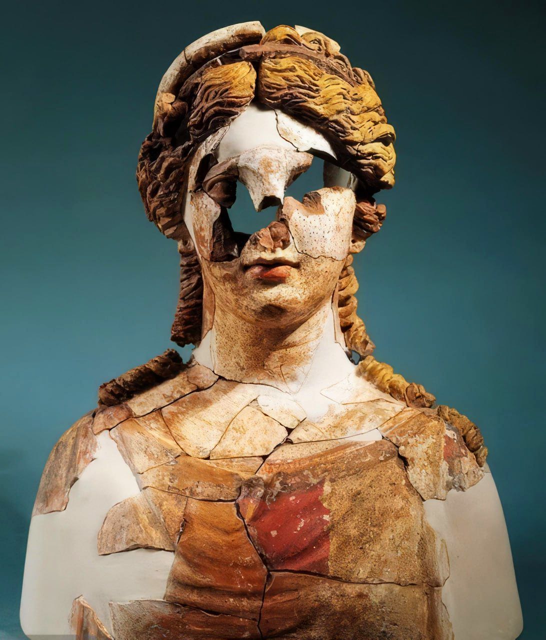 Разбитое лицо выглядит жутковато, но сам бюст в целом дает нам наглядное представление насколько ярко и необычно могли выглядеть античные статуи изначально.