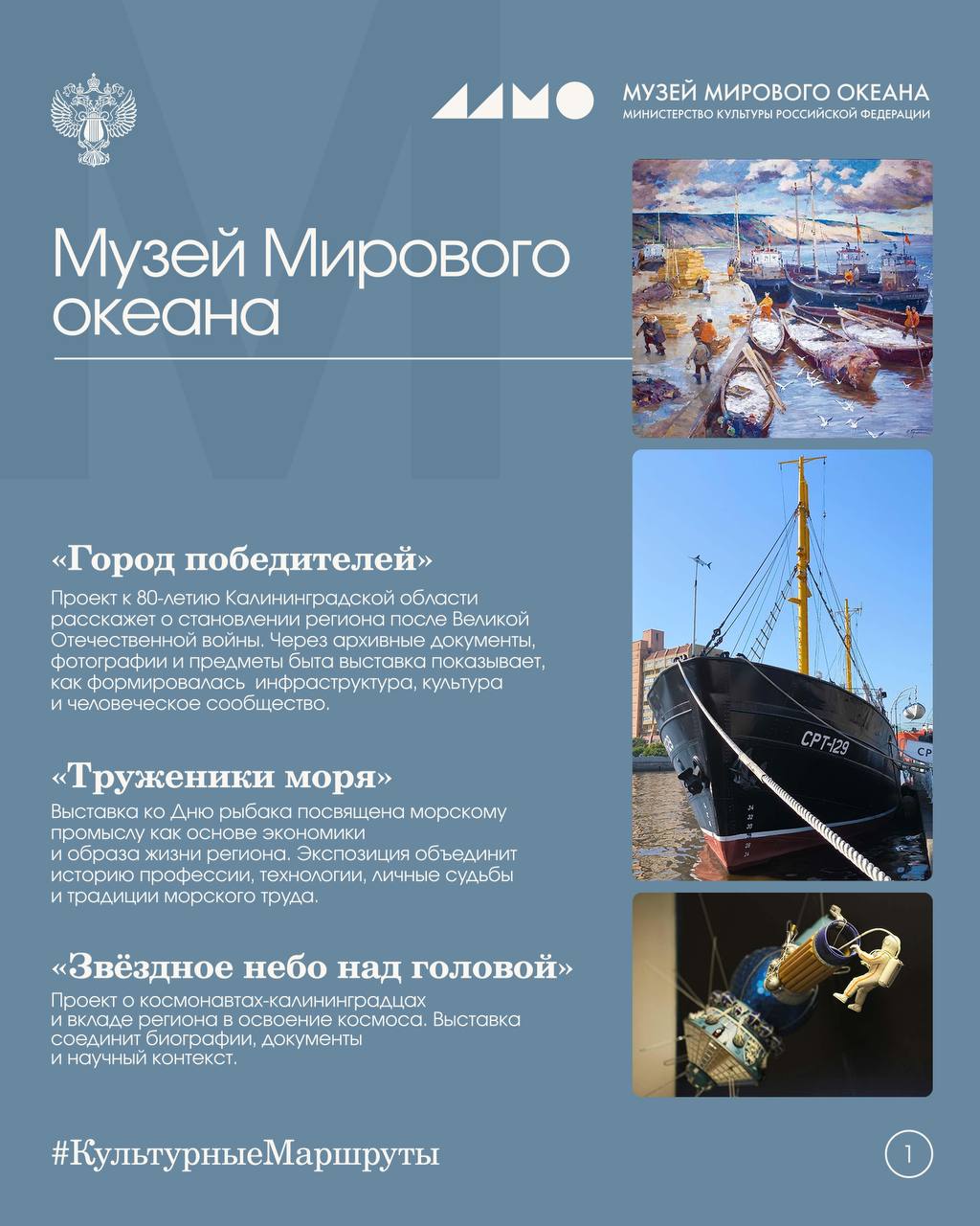 Наши #КультурныеМаршруты познакомят с выставочными проектами Музея Мирового океана, Музея истории Дальнего Востока имени В. К. Арсеньева, Рязанского музея-заповедника, Саратовского художественного музея имени А. Н. Радищева, музея-заповедника «Родина Ленина», а также Музея истории космонавтики имени К. Э. Циолковского.