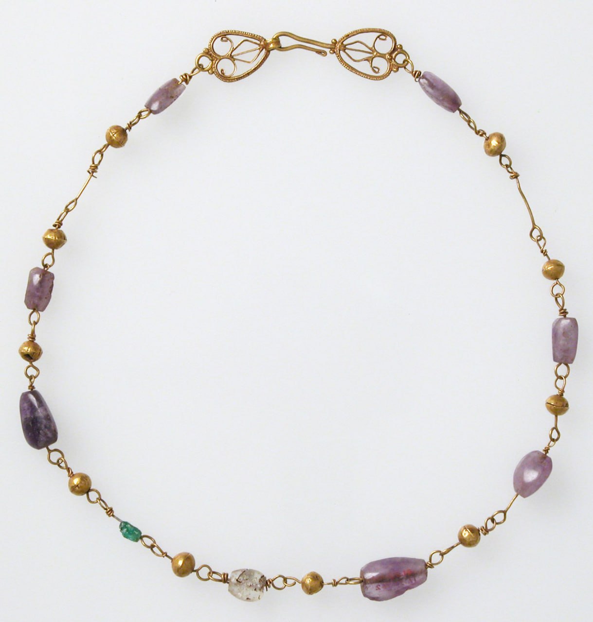 Явно не из разряда «дорого-богато», довольно скромное: изящные застежки, золотая скрученная тонкая проволока, на которую нанизаны аметисты, бусина из горного хрусталя и крохотный изумруд. Чуть не забыл — еще и маленькие золотые сферы-бусинки.
