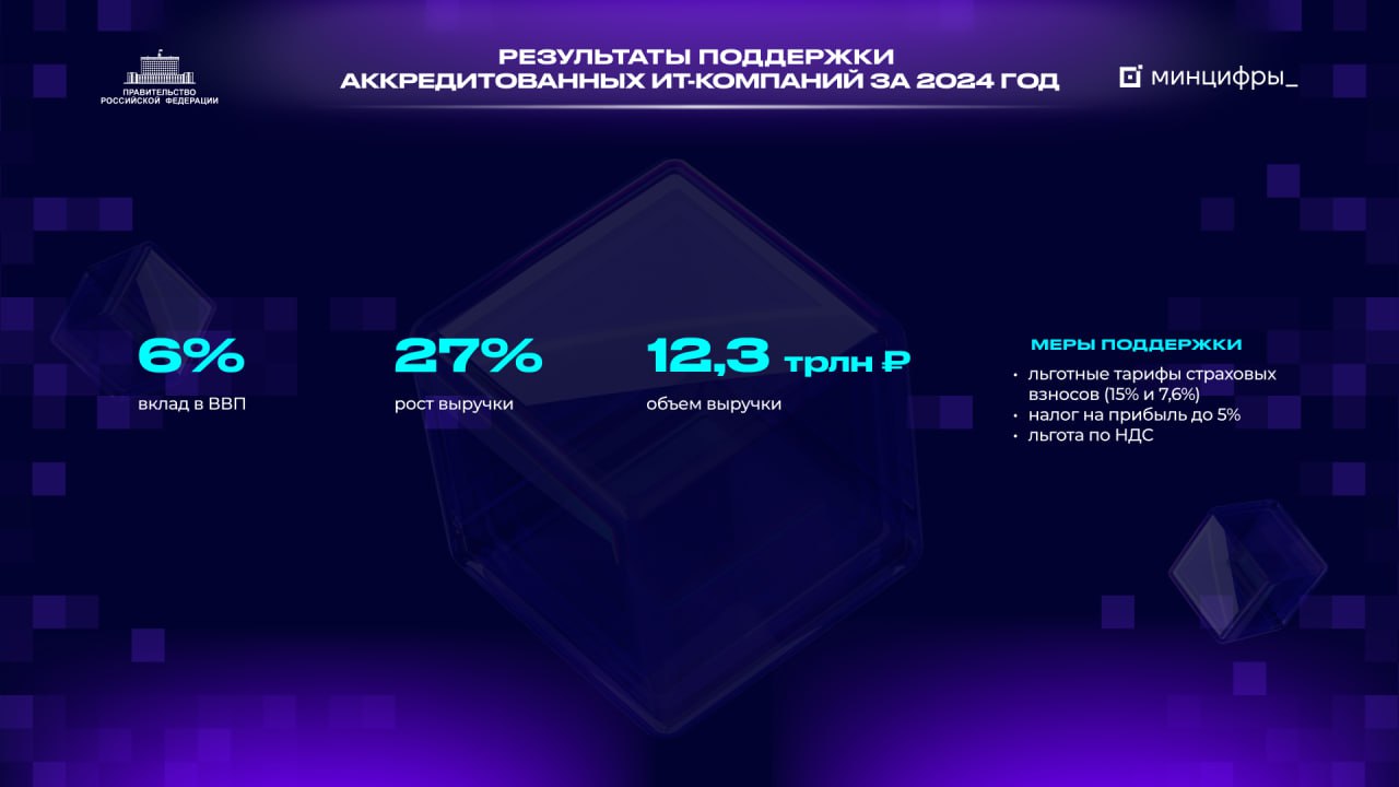 Немалую роль в развитии ИТ-отрасли сыграли различные преференции, предусмотренные для отрасли по поручению Президента прежде всего для аккредитованных организаций. В прошлом году вклад таких компаний в ВВП составил почти 6%, а их выручка увеличилась на 27%, достигнув 12 трлн рублей.