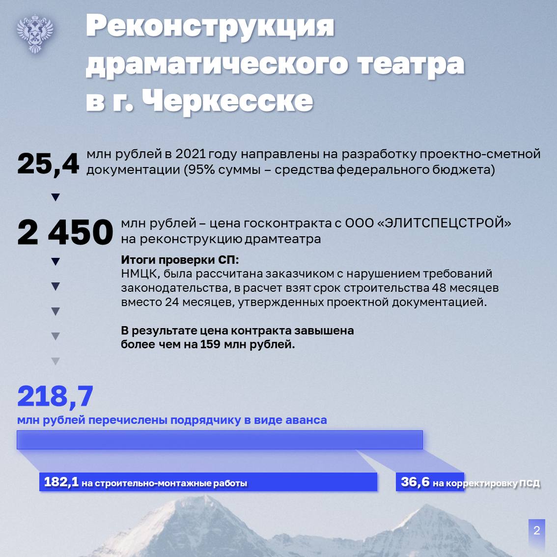 Было установлено, что 405 млн рублей, направленные в 2022-2024 годах на реконструкцию канализационных очистных сооружений в с. Эльбрус и драматического театра в г. Черкесске, были потрачены неэффективно.