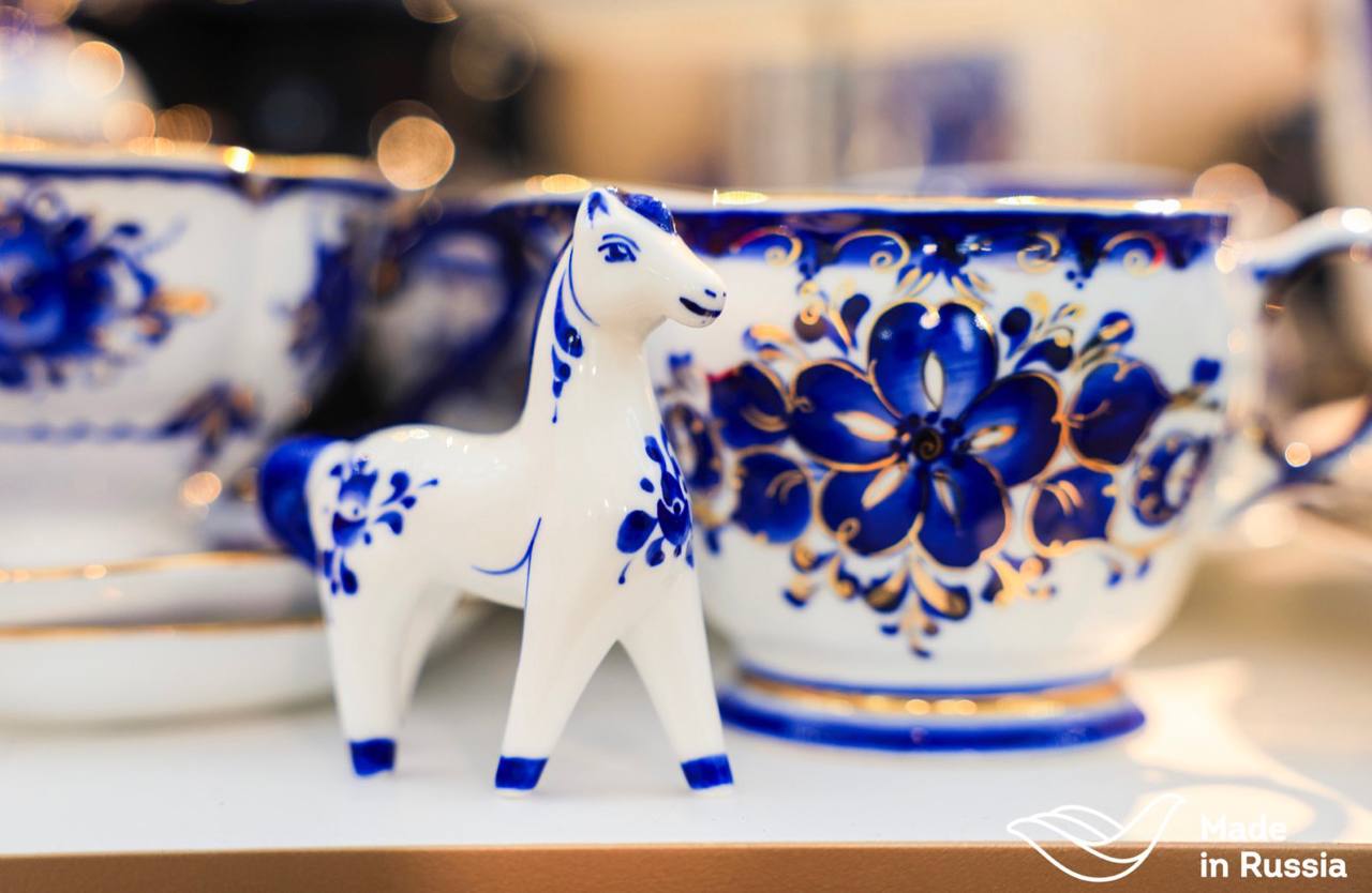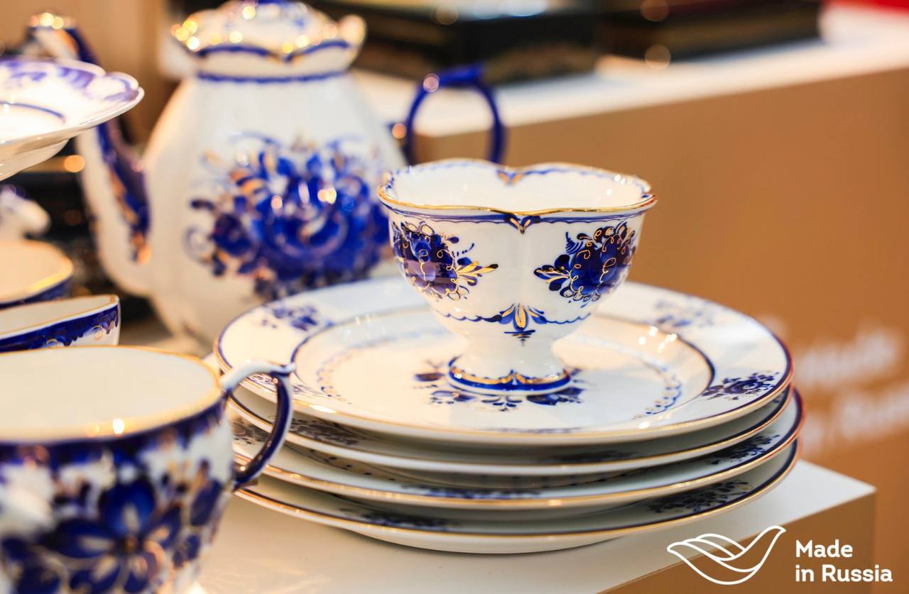 «Объединение «Гжель» представило на шоу посуду, сервизы и предметы легендарного завода с вековыми традициями художественного промысла. Палитра фирменного сине-белого стиля включает аутентичные изделия из твердого и костяного фарфора, а также современные изделия «Неогжели».
