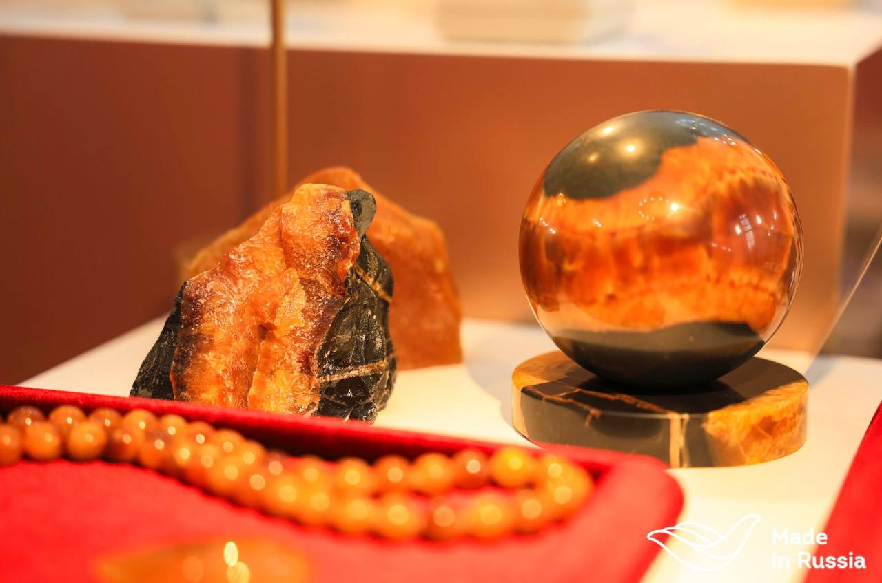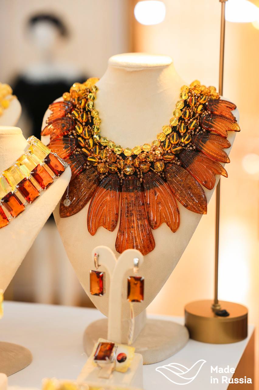 Коллекцию «Дома янтарной моды» представила дизайнер Майя Скворцова и «Калининградский янтарный комбинат». Это уникальные платья с декором из янтаря и аксессуары.