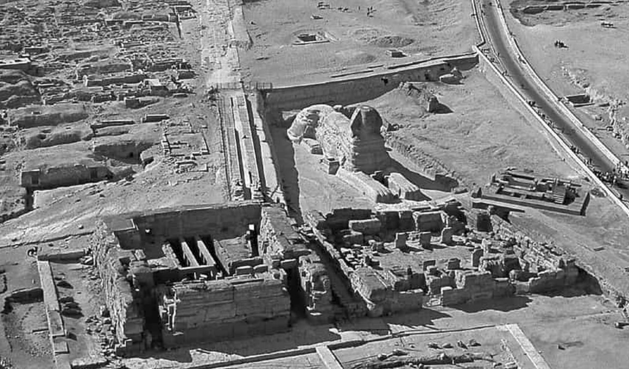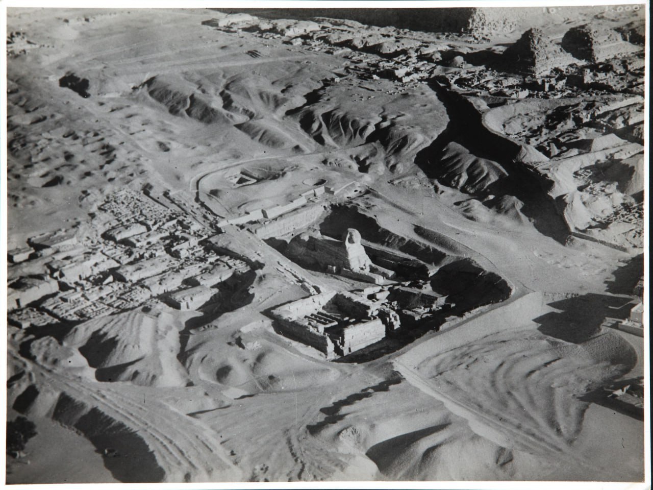 Его высота — ок. 20 м., а длина 73 м. Он вырублен из монолитной скалы известняка. На фото хорошо видно, почему Сфинкса постоянно заносило песком до уровня плеч, и над землей торчала лишь его голова.