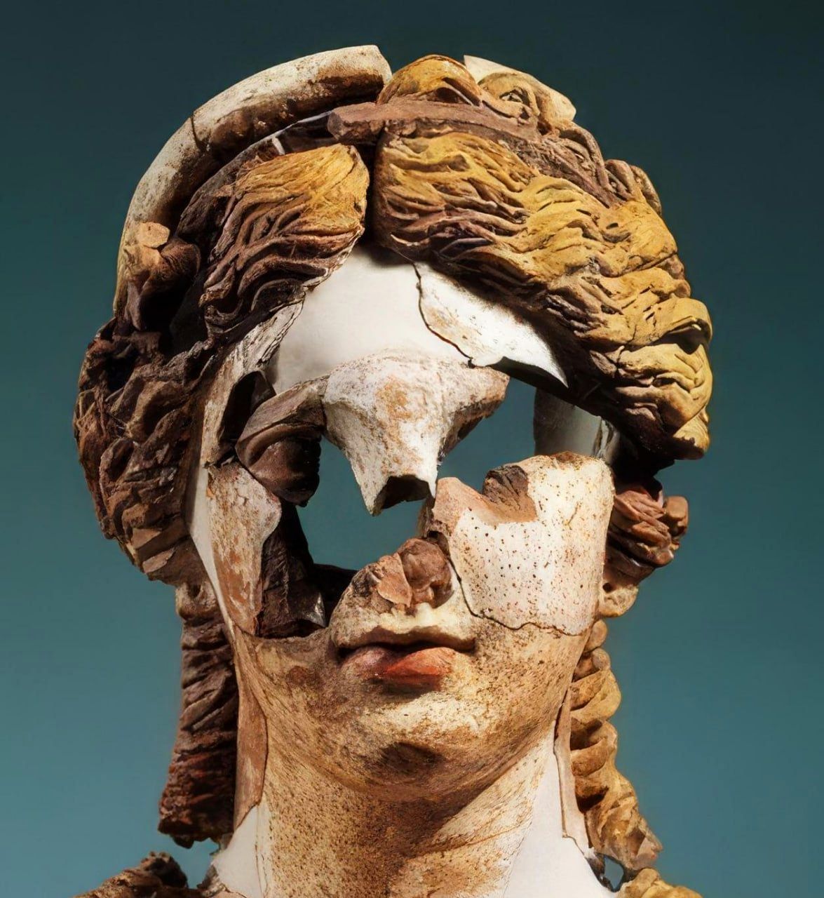 Разбитое лицо выглядит жутковато, но сам бюст в целом дает нам наглядное представление насколько ярко и необычно могли выглядеть античные статуи изначально.