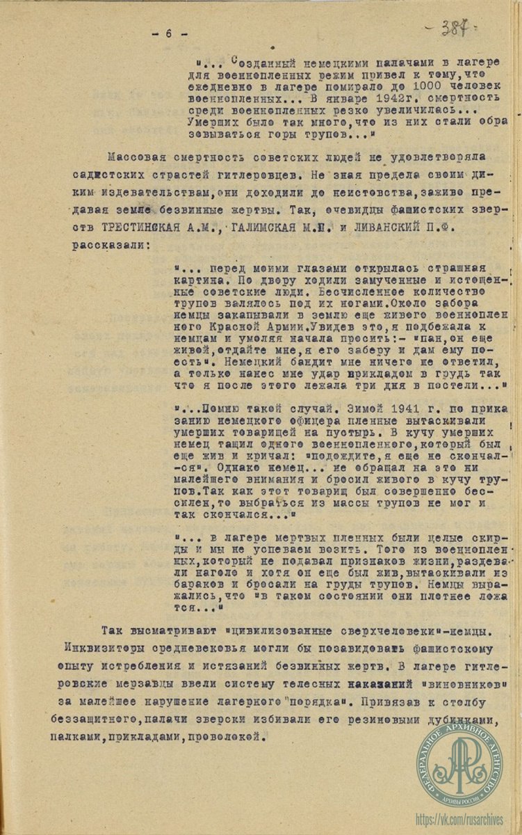 Массовое истребление мирных советских граждан, в том числе, стариков, женщин и детей, сожжение и опустошение большого количества городов и сел, грабежи, насилия и уничтожение имущества, производились под предлогом борьбы с партизанами.