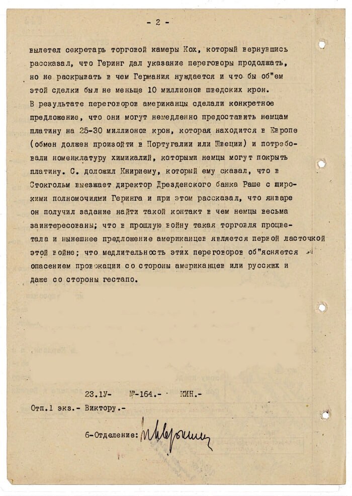 «При этом рассказал, что в январе он получил задание найти такой контакт, в чём немцы весьма заинтересованы; что в прошлую войну такая торговля процветала и нынешнее предложение американцев является первой ласточкой в этой войне».