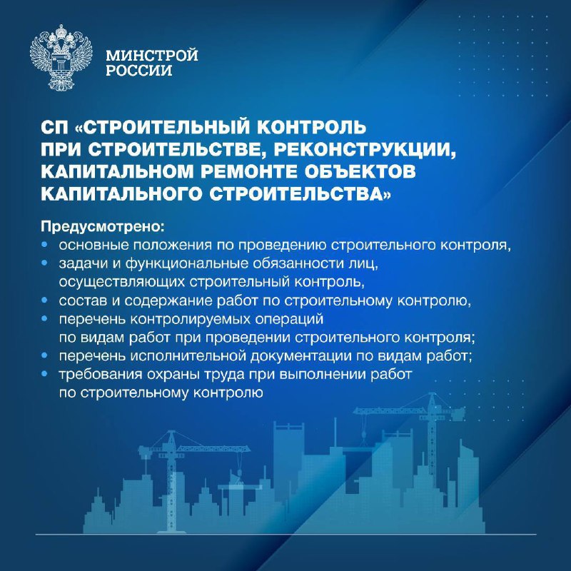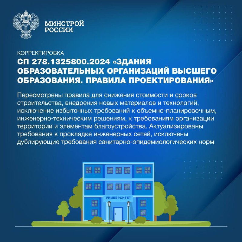 Изменение 7 к СП 256.1325800.2016 «Электроустановки жилых и общественных зданий. Правила проектирования и монтажа» Изменение 1 к СП 490.1325800.2020 «Аэродромы. Правила производства работ» Изменение 3 к СП 82.13330.2016 «СНиП III-10-75. Благоустройство территорий» Изменение 2 к СП 25.13330.2020 «СНиП 2.02.04-88. Основания и фундаменты на вечномерзлых грунтах» Изменение 3 к СП 138.13330.2012 «Общественные здания и сооружения, доступные маломобильным группам населения. Правила проектирования» Изменение 1 к СП 134.13330.2022 «Системы электросвязи зданий и сооружений. Основные положения проектирования» Изменение 1 к СП 277.1325800.2016 «Сооружения морские берегозащитные. Правила проектирования» Изменение 2 к СП 325.1325800.2017 «Здания и сооружения. Правила производства работ при демонтаже и утилизации» Изменение 3 к СП 396.1325800.2018 «Улицы и дороги населенных пунктов. Правила градостроительного проектирования» Изменение 2 к СП 126.13330.2017 «СНиП 3.01.03-84. Геодезические работы в строительстве»