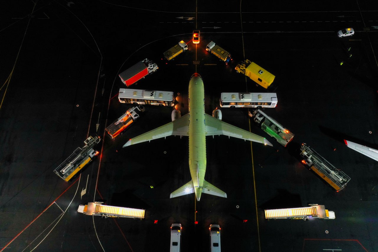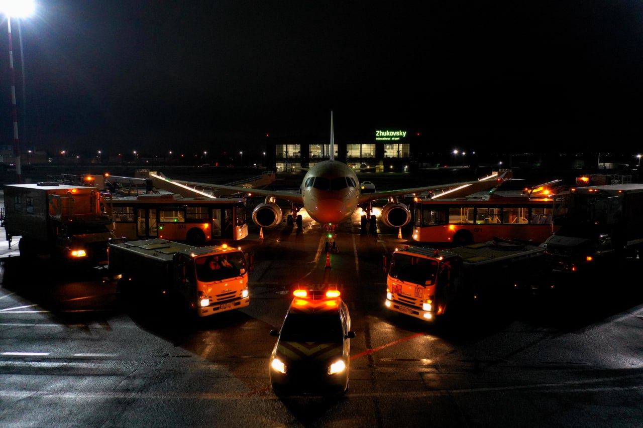 У лайнера SJ-100 нашей ОАК много работы. Самолет проходит сертификационные испытания, и уже выполнил около 30 полетов. Мы считаем, что машина заслужила праздник. На взлетно-посадочной полосе аэропорта Жуковский при помощи техники коллеги создали новогоднее настроение. Внимание на экран!