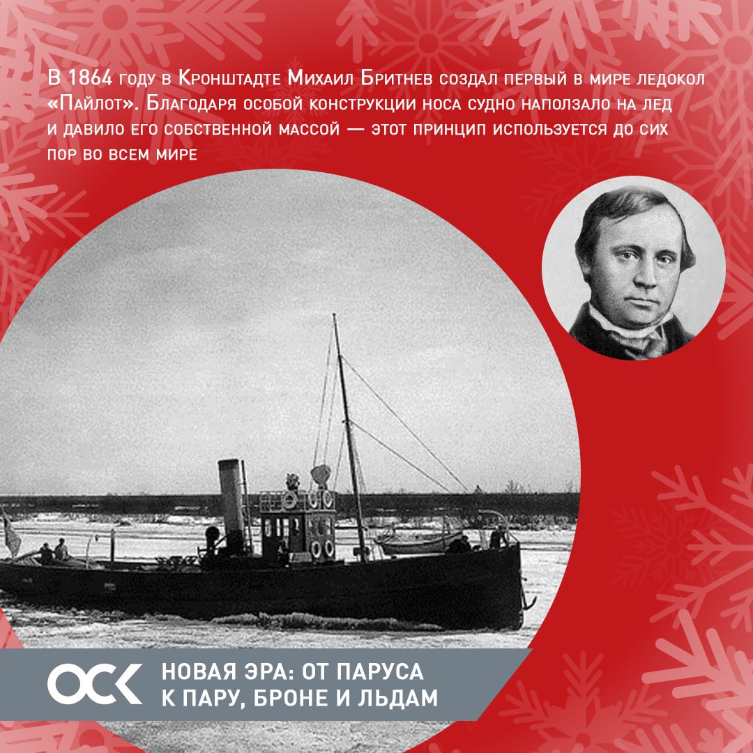 Чем мощнее становились суда, тем более амбициозные идеи появлялись у изобретателей. В 1864 году в Кронштадте Михаил Бритнев создал первый в мире ледокол «Пайлот». Благодаря особой конструкции носа судно наползало на лед и давило его собственной массой — этот принцип используется до сих пор во всем мире, а российский ледокольный флот является самым мощным.