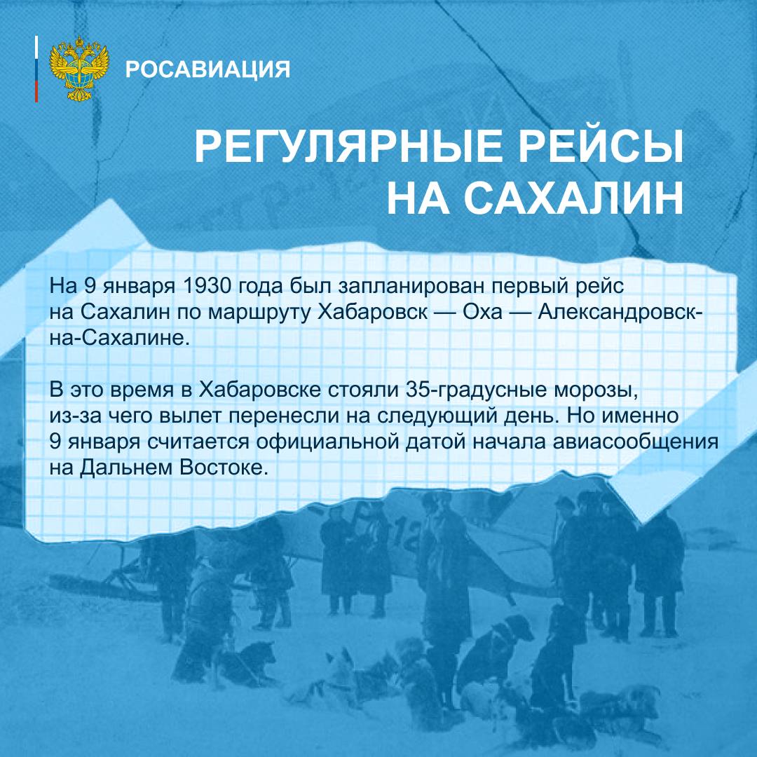 Авиасообщение, соединяющее остров Сахалин с материком, открыли советский летчик Михаил Водопьянов и бортмеханик Николай Аникин на самолете Junkers F-13. 95 лет назад, 10 января 1930 года, они выполнили перелет по маршруту Хабаровск — Оха — Александровск-Сахалинский.