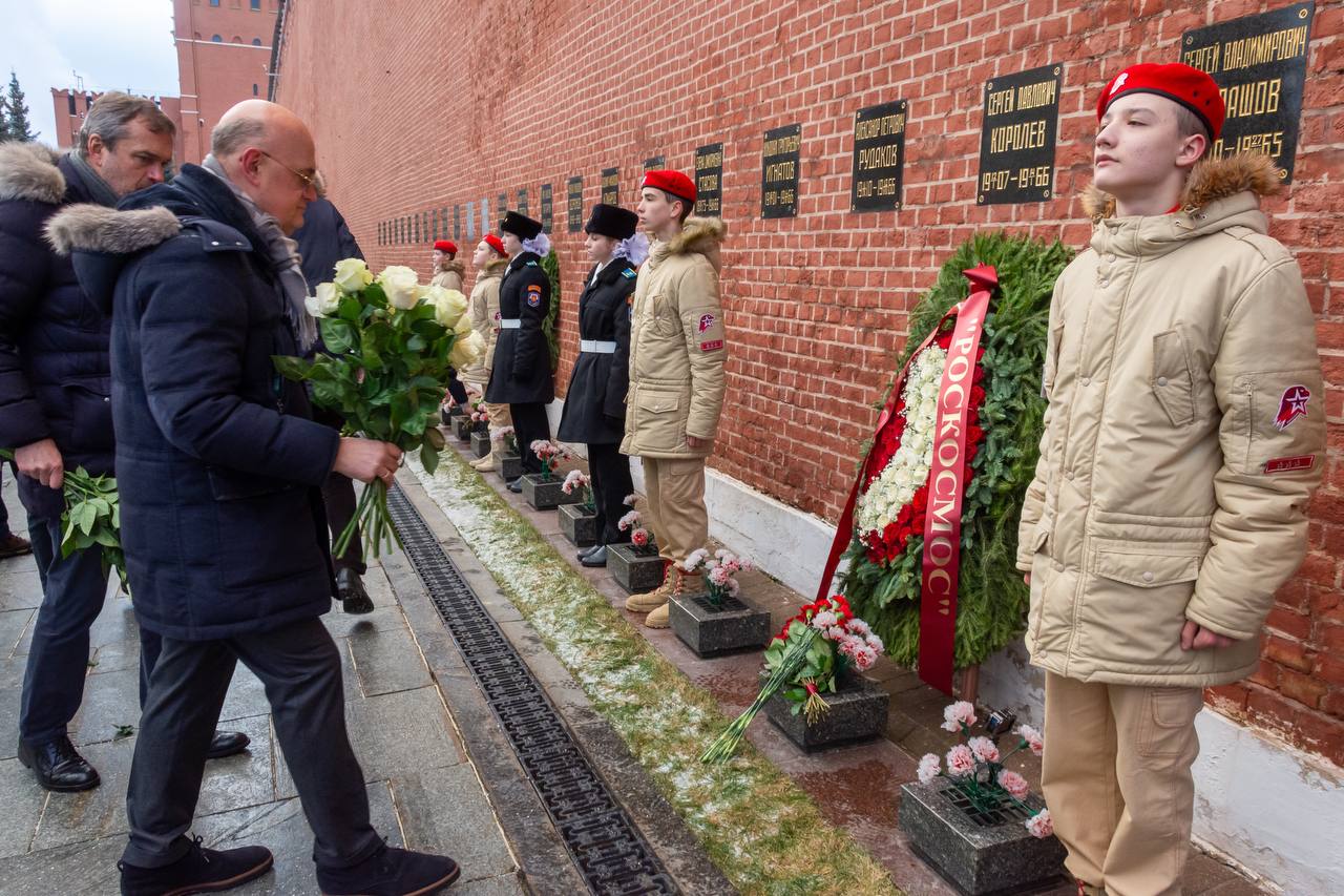 Утром у Кремлевской стены в Москве по традиции состоялась памятная церемония возложения цветов к месту захоронения праха Сергея Королева.