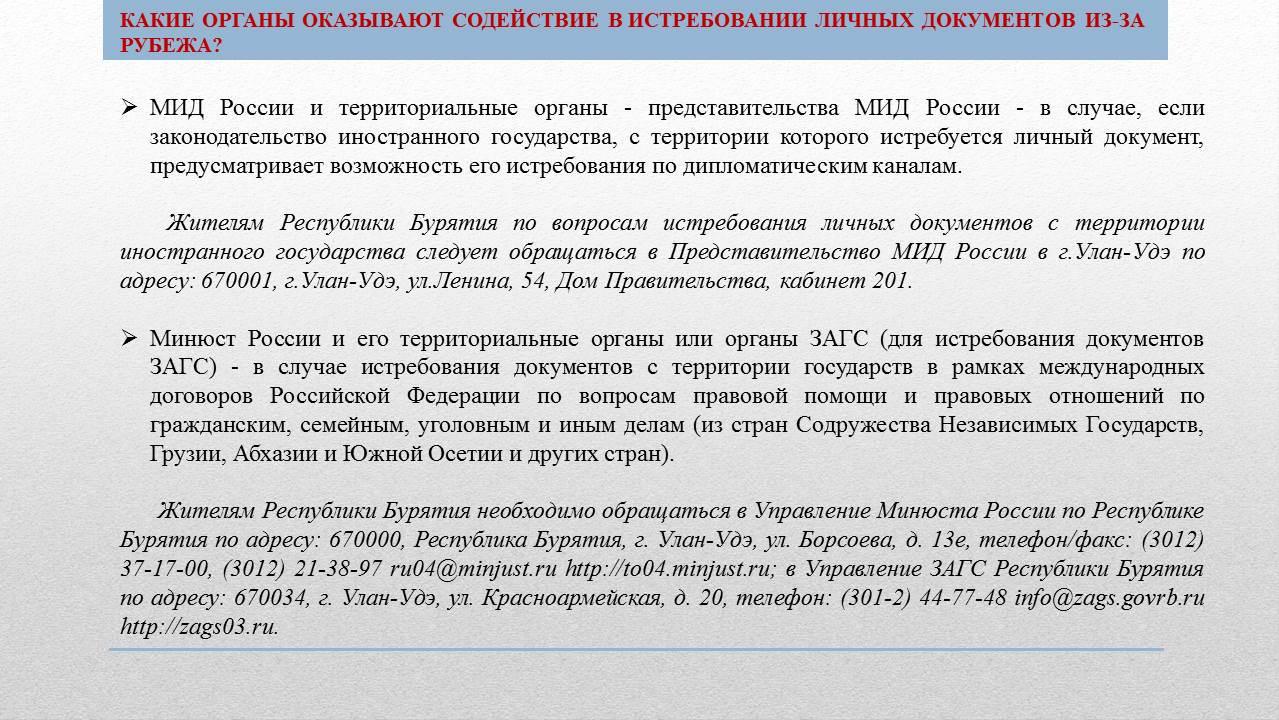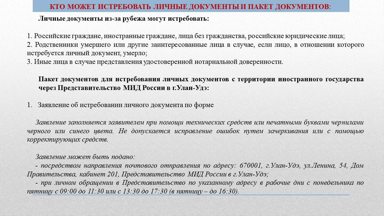 В этой связи Представительство МИД России в Улан-Удэ начинает приём заявлений граждан об истребовании личного документа из-за рубежа - документов ЗАГС, об образовании, о трудовом стаже и т.д.