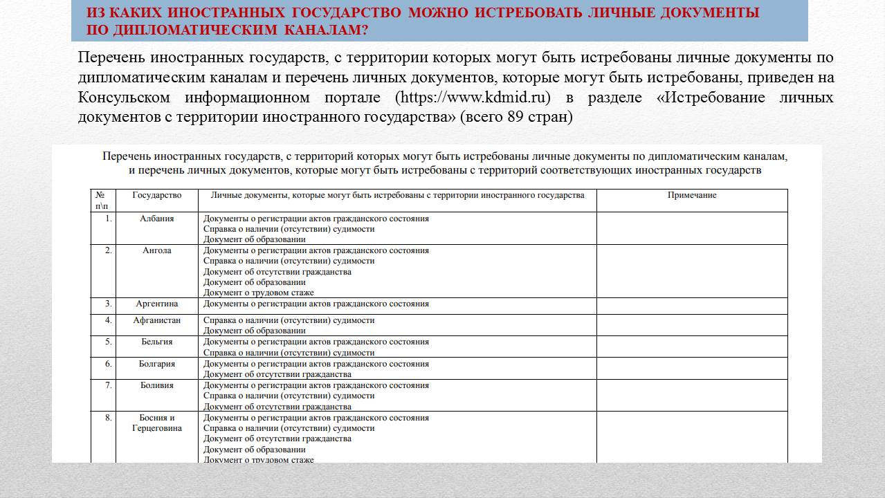 МИД России и его территориальные органы оказывают содействие в истребовании личных документов с территории иностранного государства, в случае, если законодательство иностранного государства, с территории которого истребуется личный документ, предусматривает возможность его истребования по дипломатическим каналам.