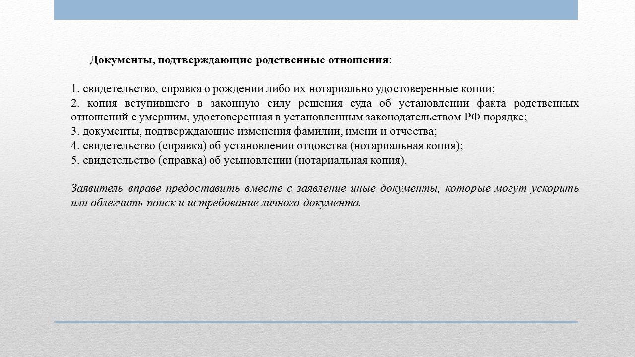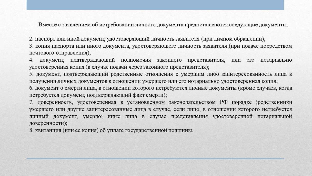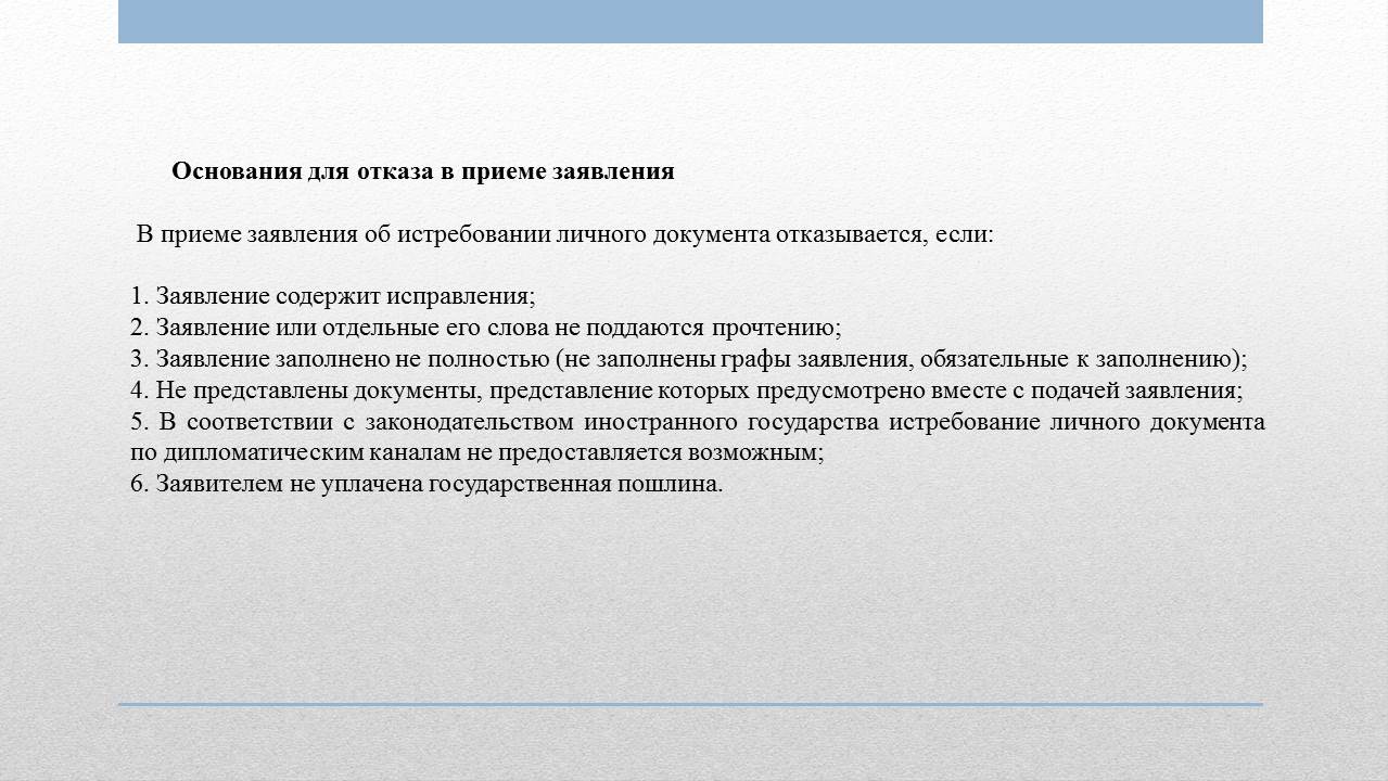 — формы заявлений об истребовании личного документа, — порядок подачи таких заявления, — перечень оснований для отказа в приёме заявлений.