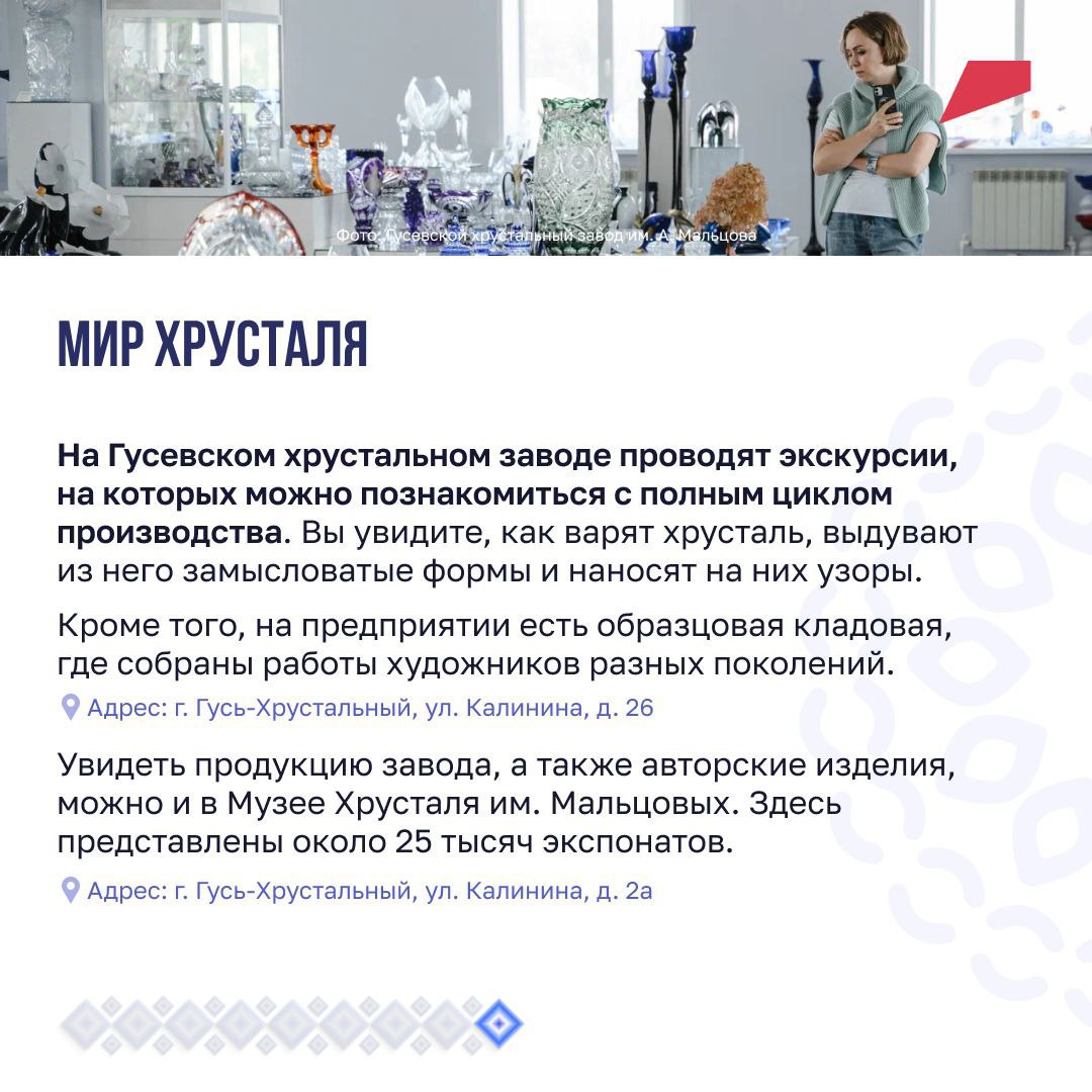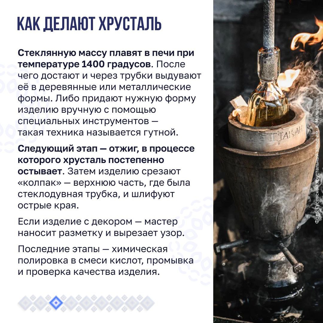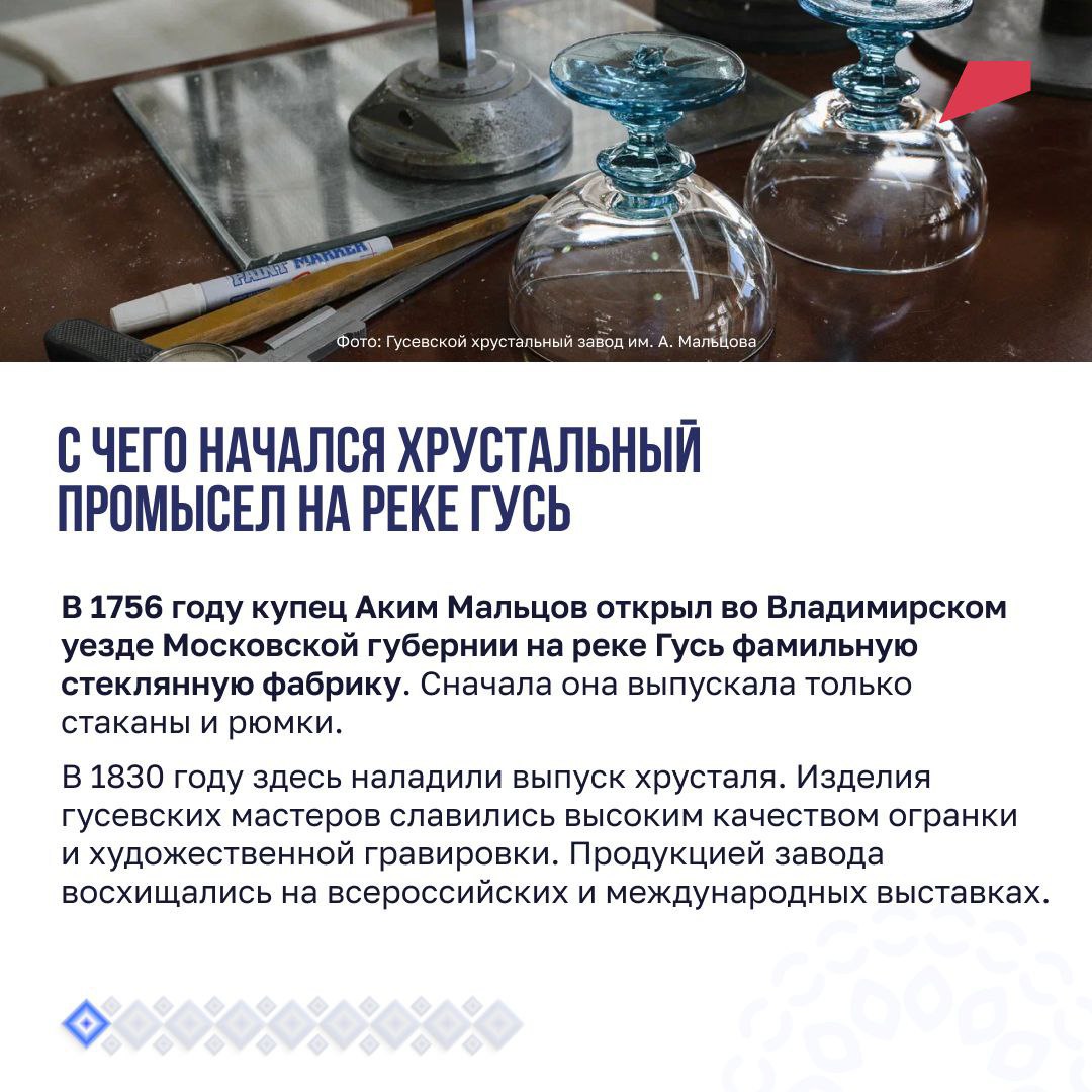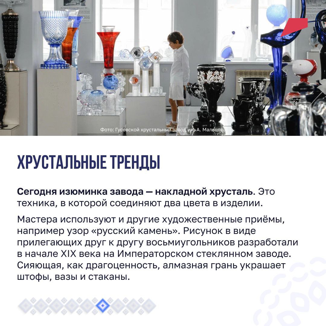 История легендарного промысла из Владимирской области началась в XVIII веке со строительства стеклянной фабрики на берегу реки Гусь. В ведомостях мануфактура числилась как «чисто русское хрустальное производство»: она работала только на отечественном сырье и топливе. Сейчас эта фабрика называется Гусевской хрустальный завод им. А. Мальцова, а её изделия известны далеко за пределами России. Подробнее о промысле читайте в нашей рубрике «Культурный код». А если хотите увидеть, как рождается хрусталь, приезжайте во Владимирскую область на экскурсию по заводу. О комфорте в путешествии позаботится нацпроект «Туризм и гостеприимство».