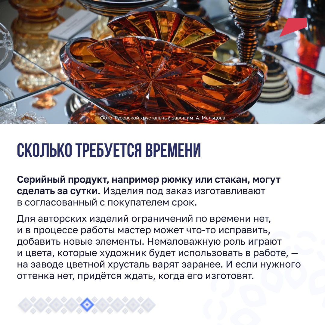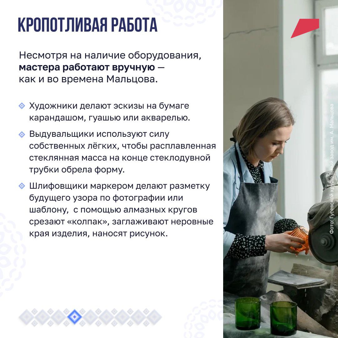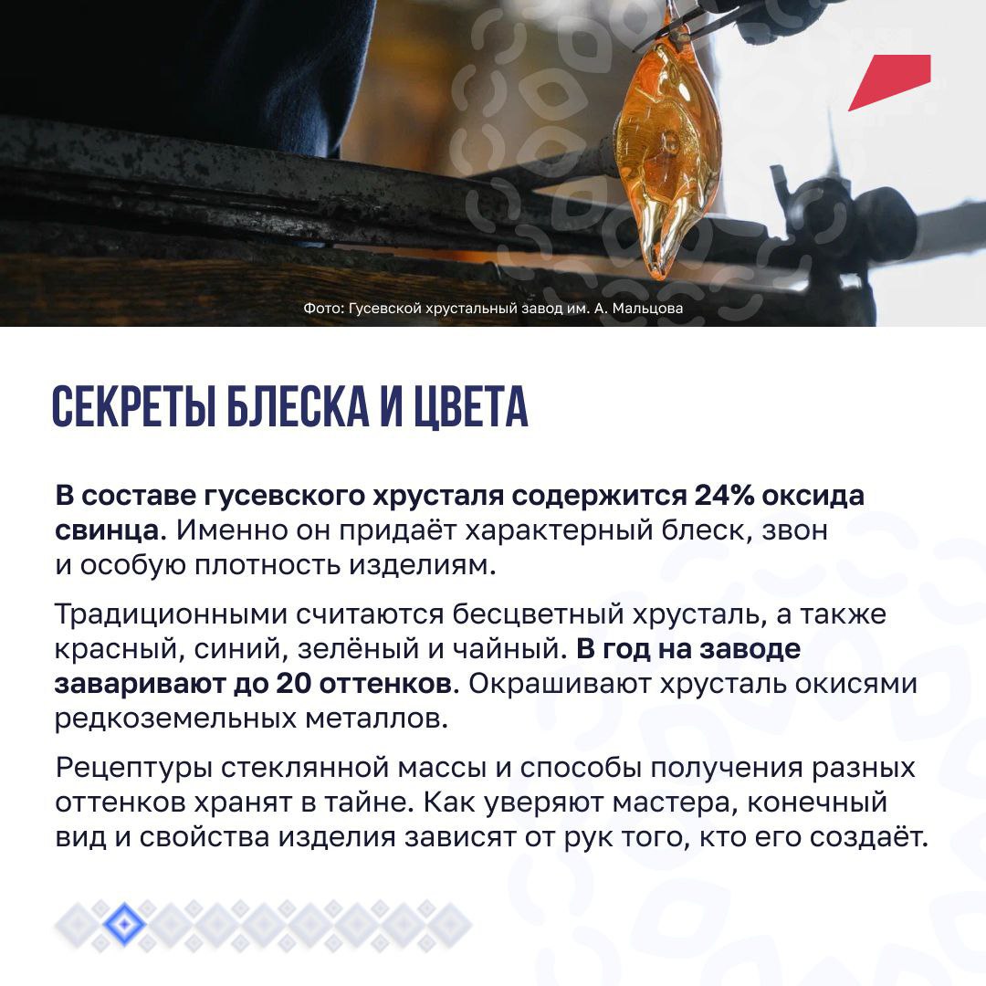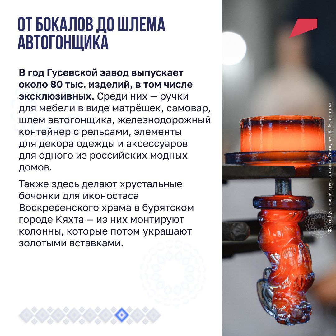 История легендарного промысла из Владимирской области началась в XVIII веке со строительства стеклянной фабрики на берегу реки Гусь. В ведомостях мануфактура числилась как «чисто русское хрустальное производство»: она работала только на отечественном сырье и топливе. Сейчас эта фабрика называется Гусевской хрустальный завод им. А. Мальцова, а её изделия известны далеко за пределами России. Подробнее о промысле читайте в нашей рубрике «Культурный код». А если хотите увидеть, как рождается хрусталь, приезжайте во Владимирскую область на экскурсию по заводу. О комфорте в путешествии позаботится нацпроект «Туризм и гостеприимство».