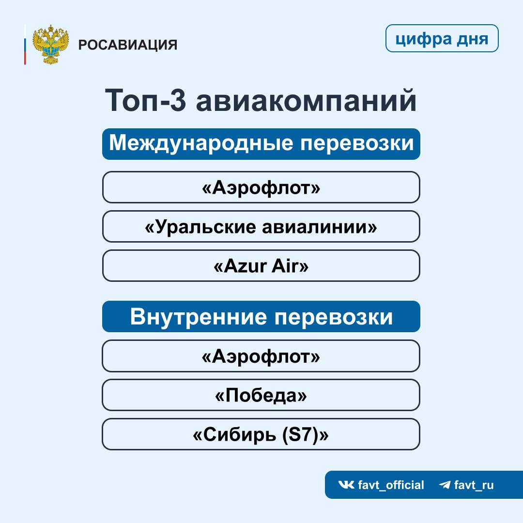 Отдельное внимание на постоянной основе уделяется обеспечению безопасности авиаперевозок», — сообщил министр транспорта Роман Старовойт. В топ-10 крупнейших перевозчиков вошли: «Аэрофлот», «Победа», S7 Airlines («Сибирь»), «Россия», «Уральские авиалинии», Utair, Nordwind («Северный Ветер»), Smartavia, Red Wings и «Азимут».