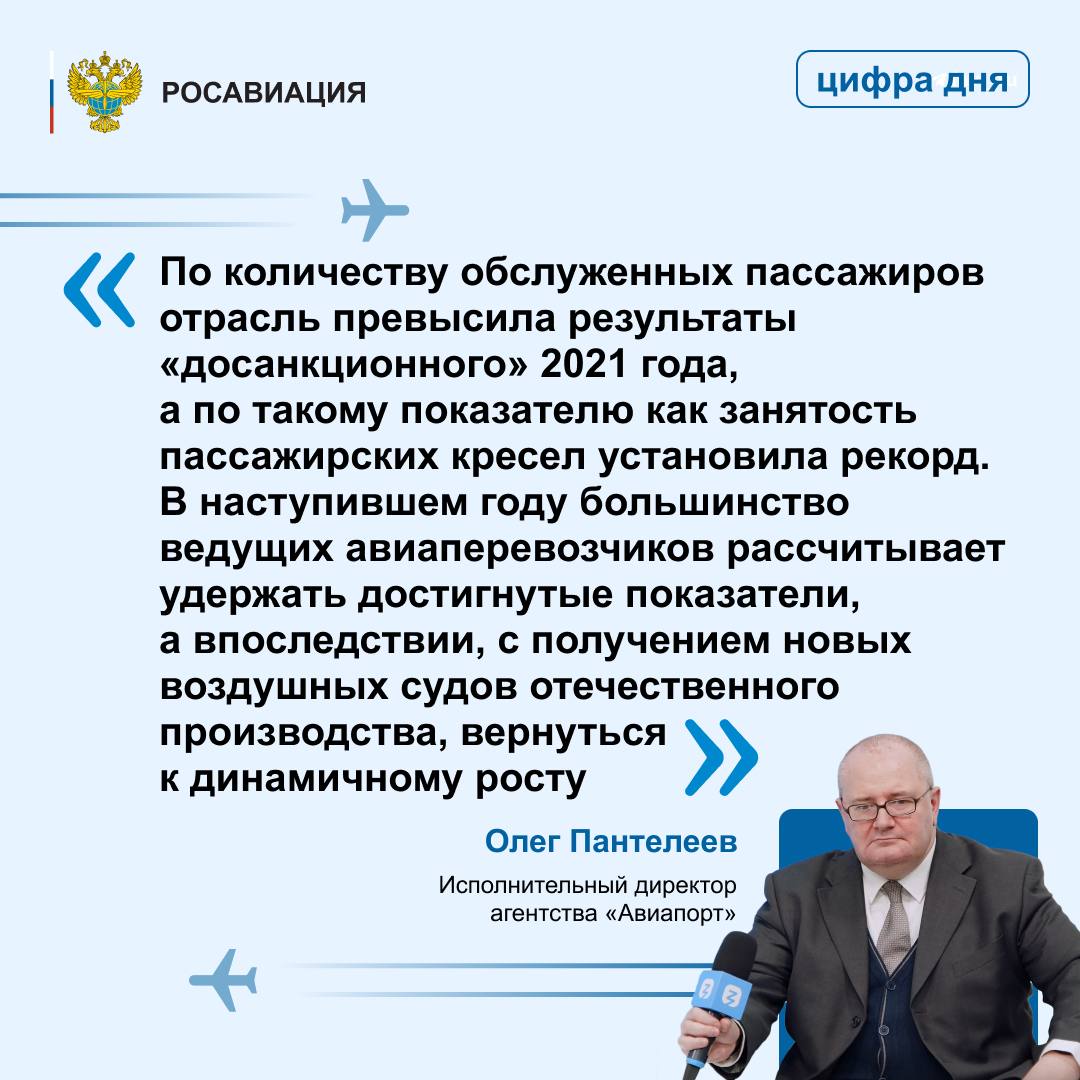 На рейсах по России перевезено 84,7 млн пассажиров (рост на 2%), на международных рейсах – 27 млн человек (рост на 20,1%). «Воздушный транспорт продолжает стабильно выполнять свою стратегическую роль в интересах развития России. Несмотря на внешнее санкционноедавление, результаты авиаперевозок перекрыли уровень 2021 года.