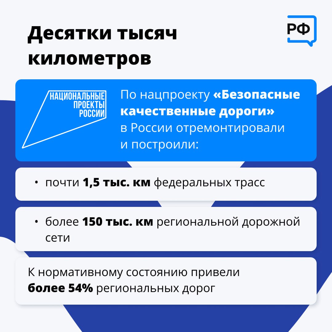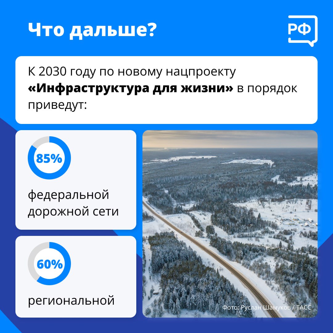 Ему на смену пришёл новый нацпроект «Инфраструктура для жизни». Благодаря ему в порядок приведут 85% федеральных и 60% региональных дорог.