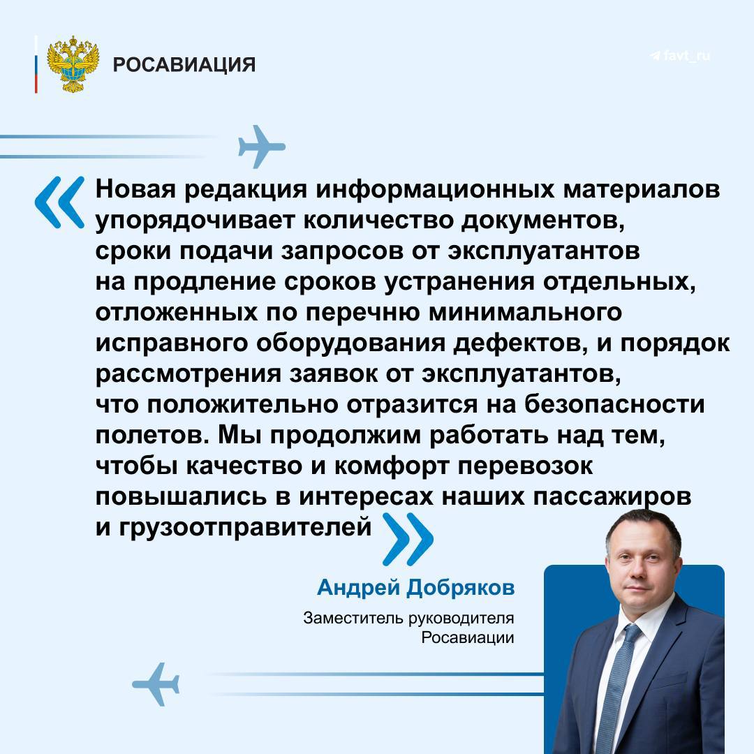 Разработанный порядок, отраженный в информационных материалах, позволяет эксплуатантам импортной авиатехники в условиях беспрецедентного санкционного давления на отечественную гражданскую авиацию со стороны недружественных России государств увеличить время приобретения запасных частей, агрегатов и компонентов, документации для проведения технического обслуживания с сохранением должного уровня безопасности полетов.