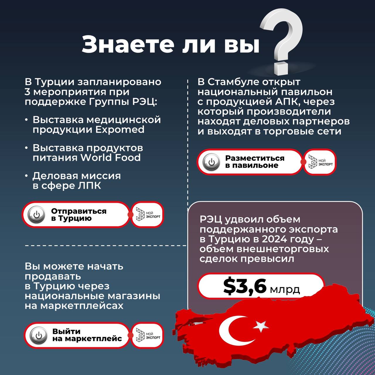 13 марта в 10:00 (мск) обсудим: Перспективные направления для экспорта в Турцию Тарифные и нетарифные барьеры на пути выхода на рынок Проведение финансовых платежей с учетом местных особенностей Логистику и транспортировку товаров Участие в выставках и других международных мероприятиях в Турции