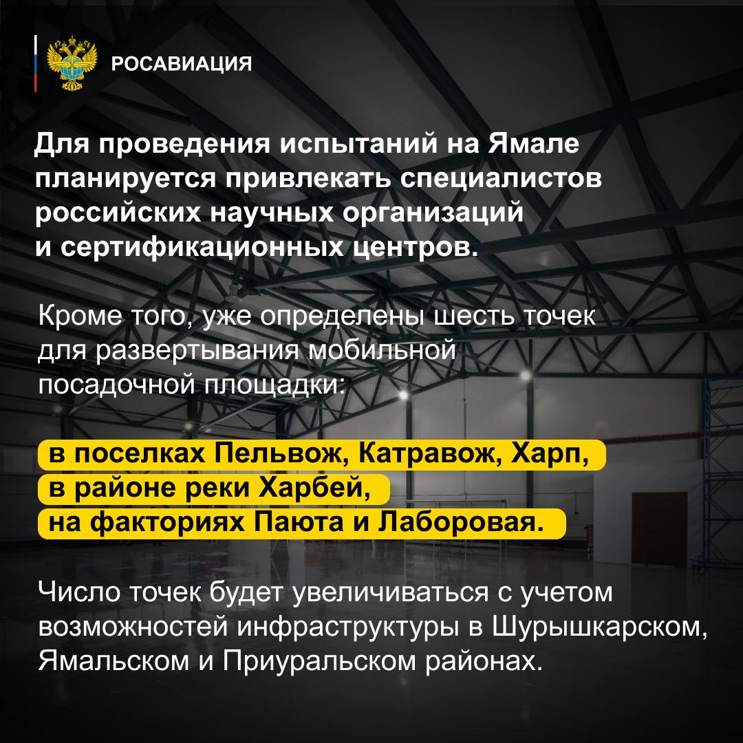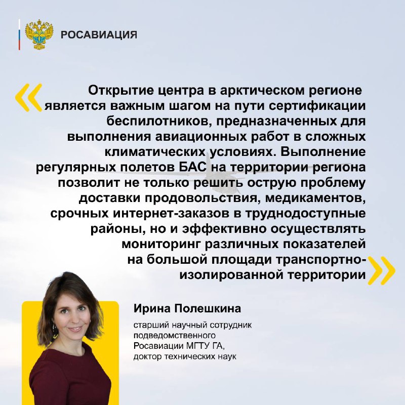 Сегодня в городе Салехард Ямало-Ненецкого автономного округа открыли Арктический испытательный центр, который появился благодаря реализации курируемого Росавиацией федпроекта «Развитие инфраструктуры, обеспечение безопасности и формирование специализированной системы сертификации БАС» нацпроекта «Беспилотные авиационные системы».