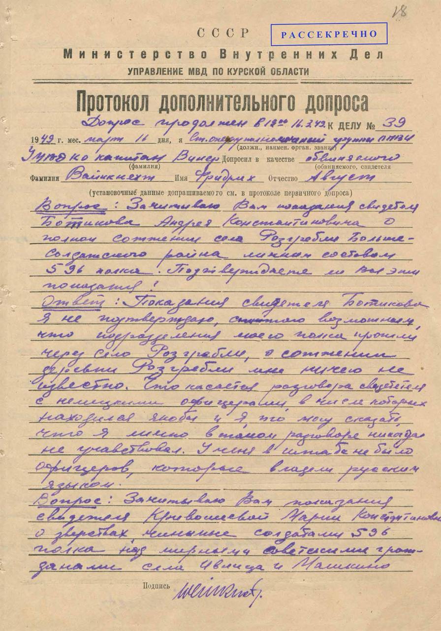 «...Этот расстрел мирных советских граждан имел место в конце февраля 1943 года в одной деревне, название которой мне неизвестно, что в 2-3 километрах южнее деревни Машкино... Расстрел... мирных советских граждан, среди которых находились женщины и дети, был произведён по приказу... полковника Вайнкнехта...».