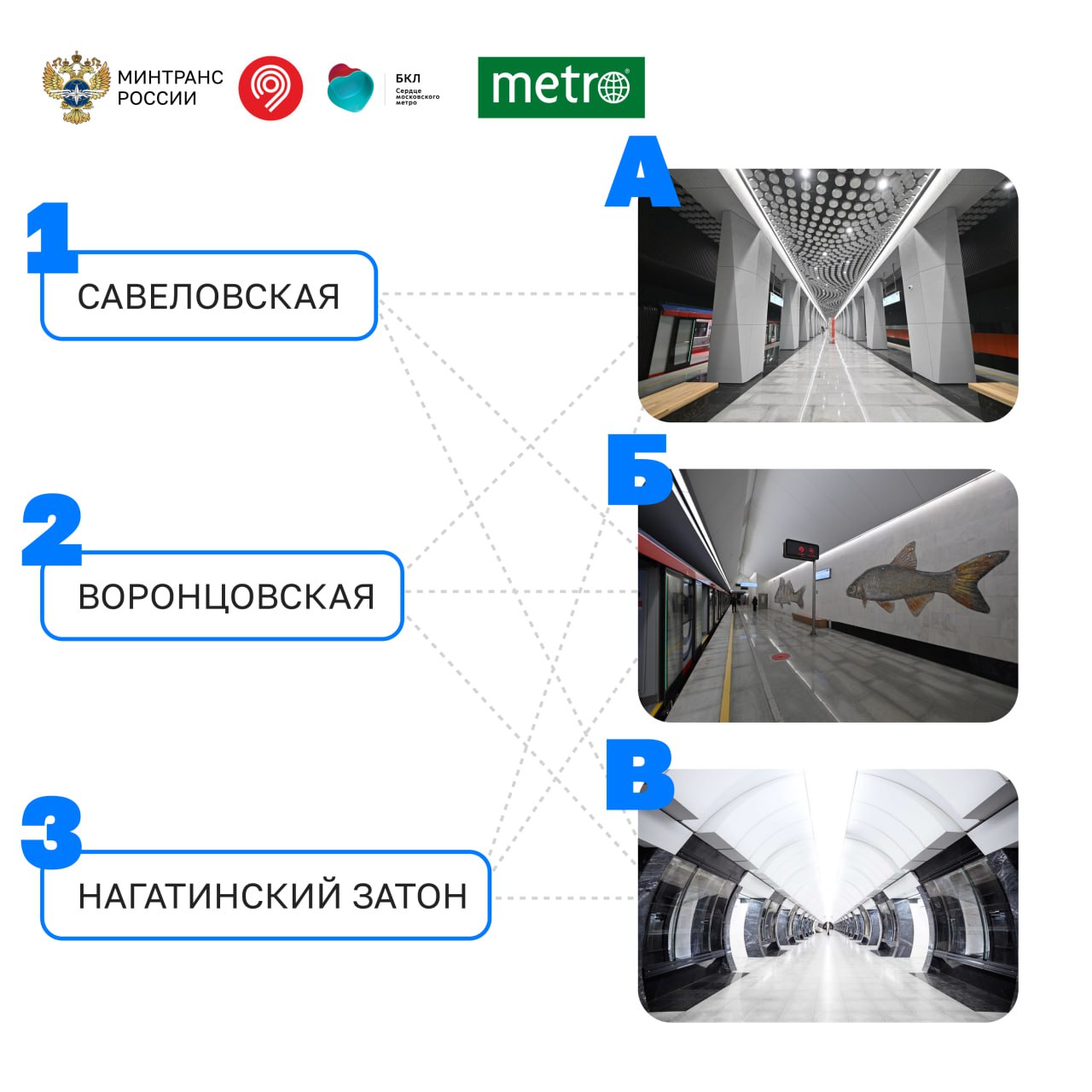 Сопоставьте названия станций с фото и напишите ответ в комментарии (например, 1-А, 2-Б, 3-В).