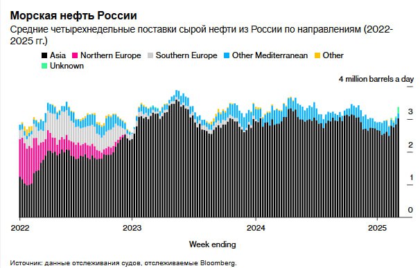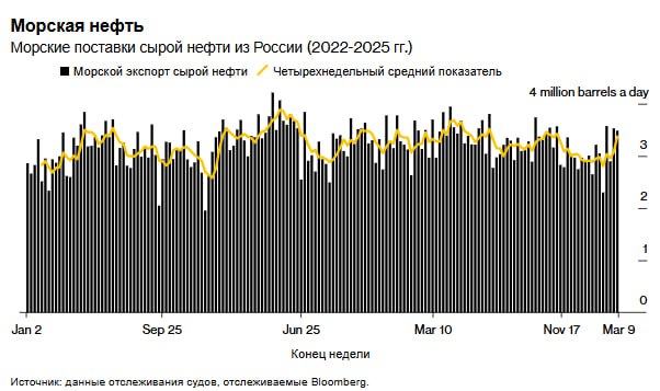 В январе администрация Байдена внесла в черный список еще 161 судно, что временно сократило поставки. Однако Трамп, добиваясь прекращения конфликта, может смягчить ограничения. Экспорт нефти из российских портов за четыре недели к 9 марта вырос на 300 000 баррелей в день, достигнув 3,37 млн — максимум с 10 ноября.