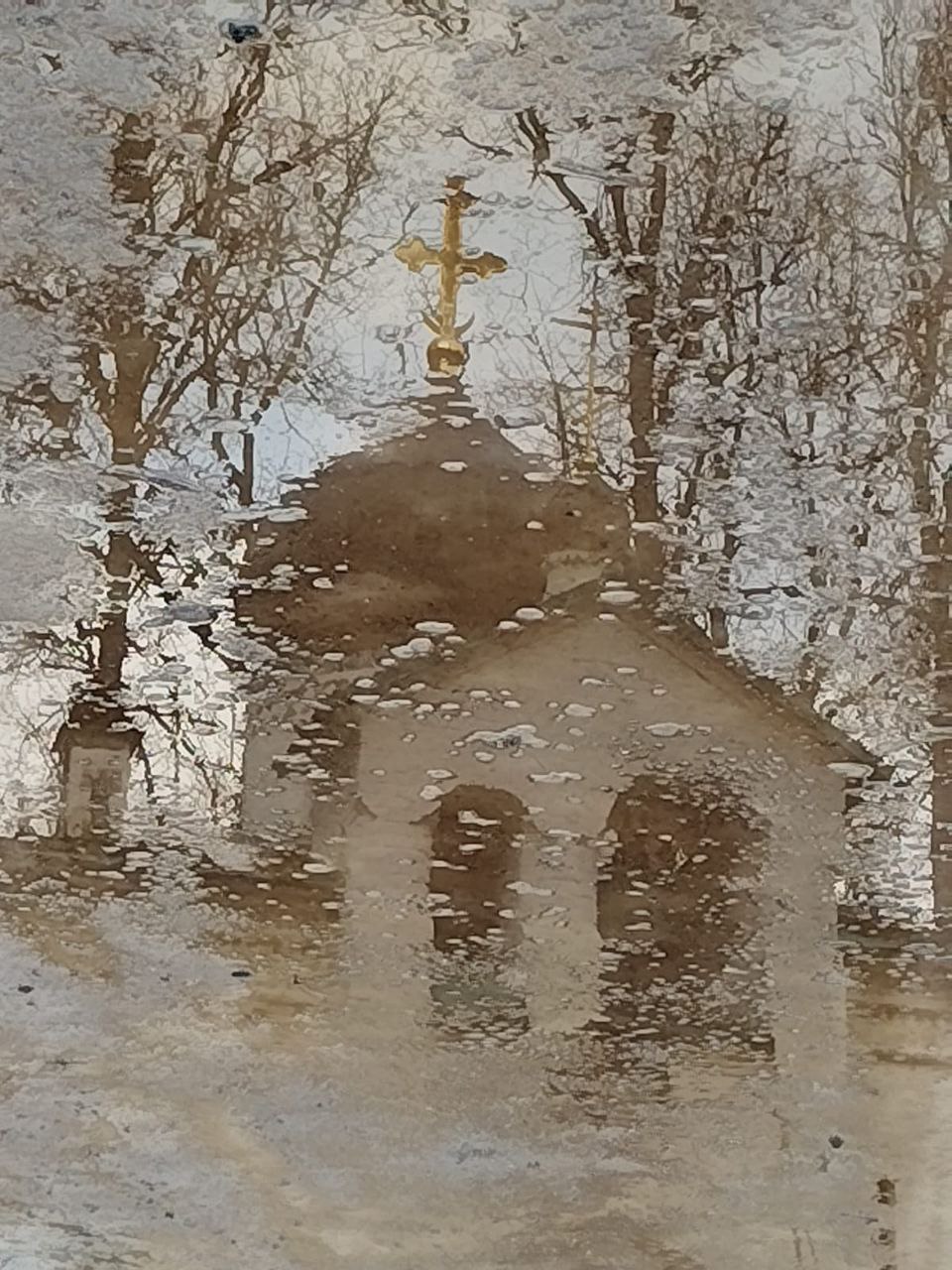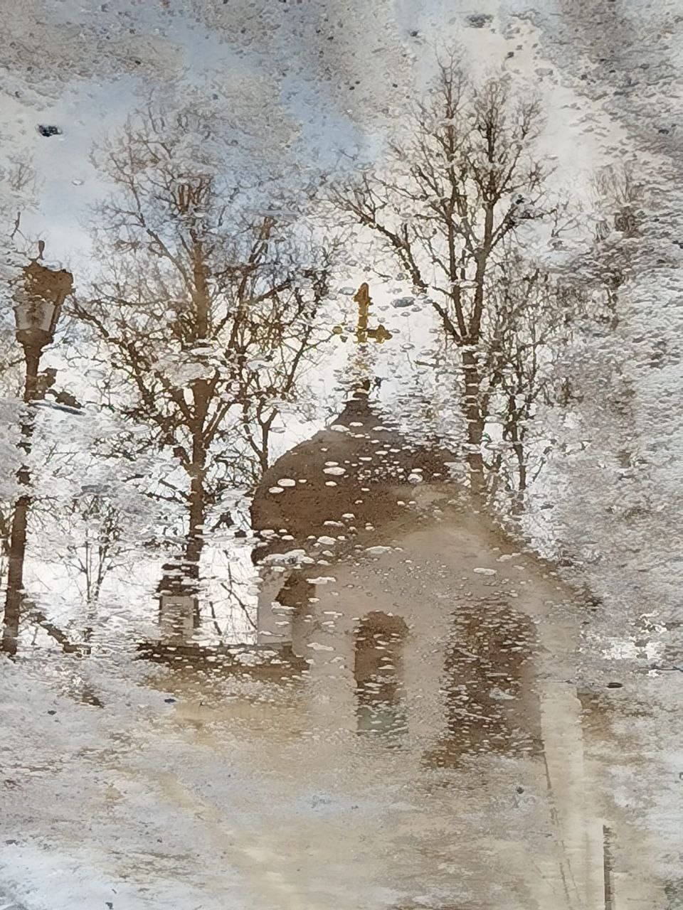 Храм Спаса Нерукотворного в Абрамцеве в отражении небесной воды — напоминание о том, как природа могущественна в создании собственных шедевров.