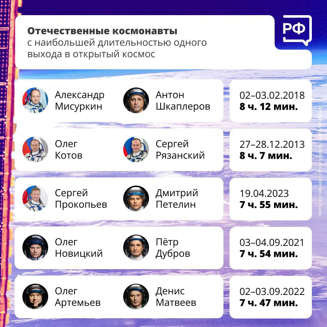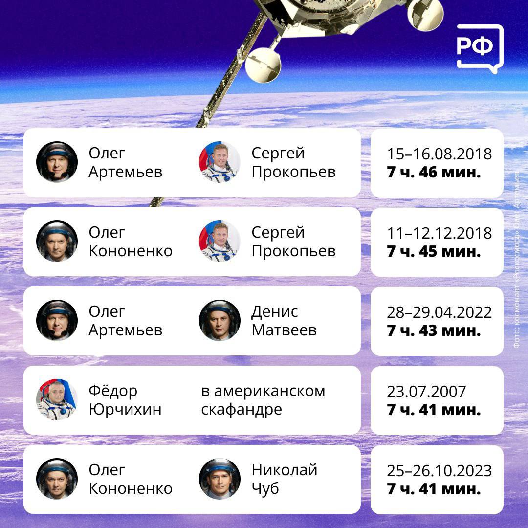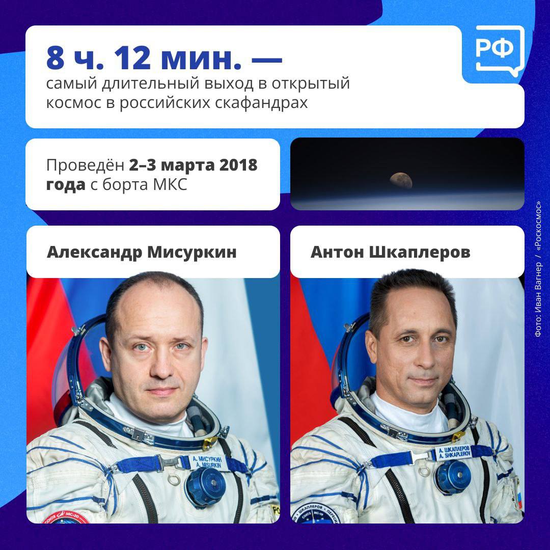 В выходах приняли участие 75 космонавтов СССР и России. Самый длительный выход в открытый космос в российских скафандрах был проведён 2-3 марта 2018 года космонавтами Александром Мисуркиным и Антоном Шкаплеровым с борта Международной космической станции — 8 часов 12 минут.