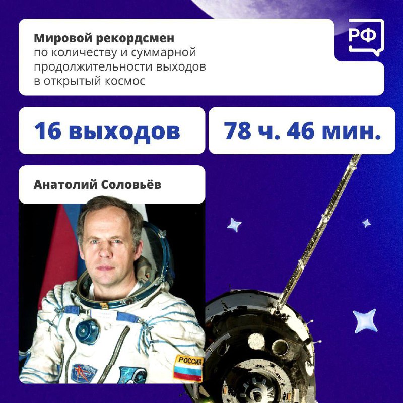 Мировой рекордсмен по количеству и суммарной продолжительности выходов в открытый космос — Анатолий Соловьёв — 16 выходов и 78 часов 46 минут, соответственно.