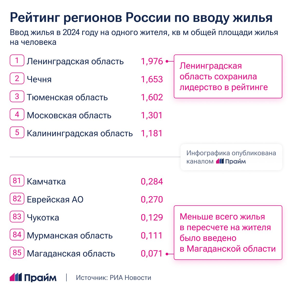 Объем ввода жилья в 2024 году составил 107,8 миллиона квадратных метров, что на 2,4% ниже, чем в 2023 году. В пересчете на одного жителя России ввели 0,738 квадратных метров жилья, но диапазон значений показателя в российских регионах очень широк и отличается в разы.