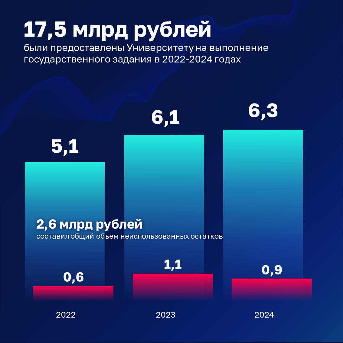 1. На выполнение государственного задания в 2022-2024 годах Университет получил 17,5 млрд рублей, однако 2,6 млрд из них не были использованы.