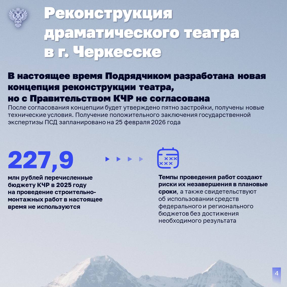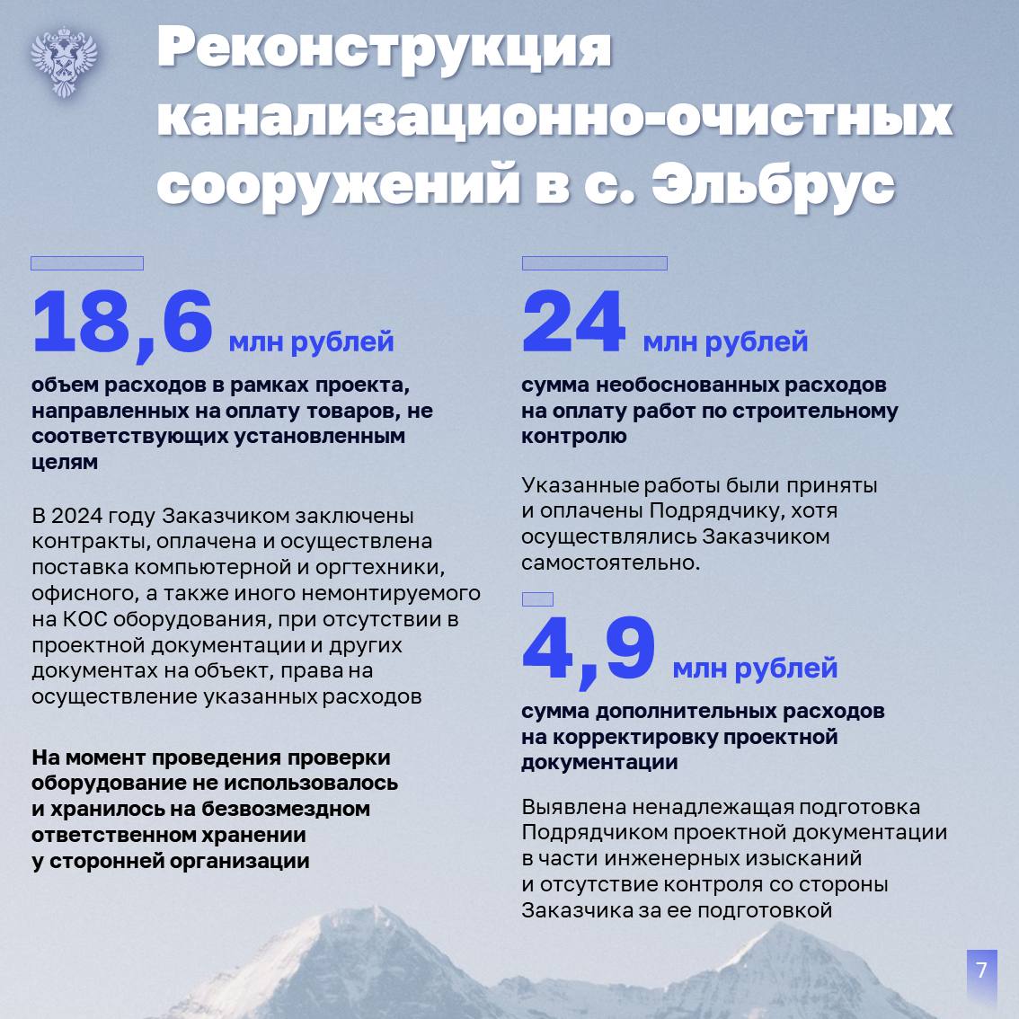 Было установлено, что 405 млн рублей, направленные в 2022-2024 годах на реконструкцию канализационных очистных сооружений в с. Эльбрус и драматического театра в г. Черкесске, были потрачены неэффективно.